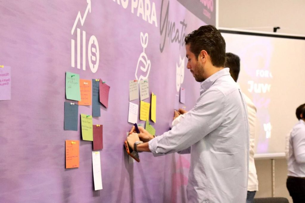 Los participantes hicieron saber a través de tarjetas que colocaron en una mampara, los símbolos que representaban los temas de: medio ambiente, economía, cultura, salud, así como abordar un tema libre, respondiendo una pregunta: ¿Qué quiero para Yucatán?
