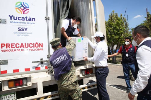 El lote de vacunas fue descargado por personal del Ejército, y colocadas en un camión thermoking propiedad de la SSY, para ser trasladadas al almacén estatal de vacunas, desde donde se distribuirán a los lugares donde se aplicarán.