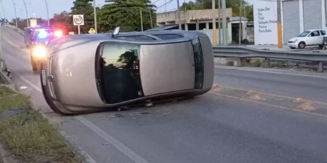 Se registró un fuerte accidente hoy 25 de agosto, en la Tixkokob – Mérida, en donde un auto terminó volcado y varios más quedaron varados en la vía.