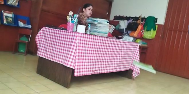 En el video se observa a la maestra sentada en su escritorio con una pila de cuadernos encima, mientras califica las tareas o trabajos de los estudiantes, quienes permanecen en silencio dentro del salón.