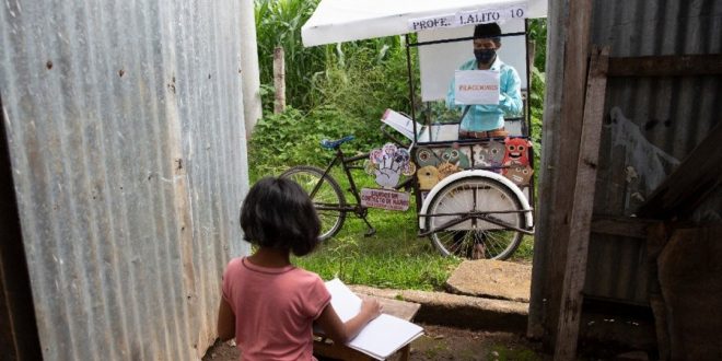 Su triciclo es más que un medio de transporte. Es un salón de clases móvil con pizarra y plástico de protección contra el COVID-19. Incluso tiene un panel solar para dar energía a un reproductor de audio.