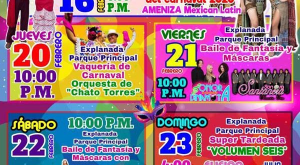 El viernes 21 en la explanada del parque principal se presentará un baile de fantasía y mascaras presentando a la sonora dinamita y la sonora Santanera con una admisión general de 50 pesos.