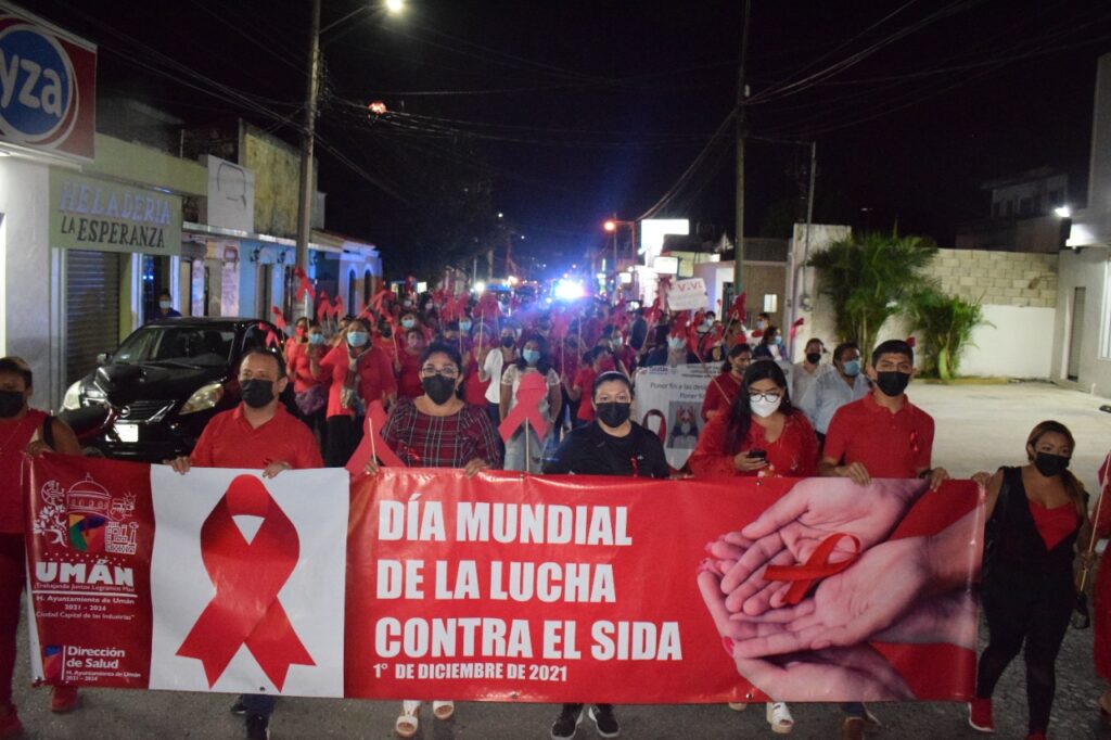 Umán, Yucatán a 2 de diciembre de 2021.- Con el compromiso de impulsar acciones para la concientización, prevención y lucha contra el VIH-SIDA, el Ayuntamiento de Umán a través de la Dirección de Atención y Protección a la Mujer por medio de su Coordinación LGBT+, llevaron a cabo una marcha en conmemoración del Día Mundial de Lucha contra el VIH-SIDA que partió de la ex estación de ferrocarriles hasta el campo deportivo Solidaridad.