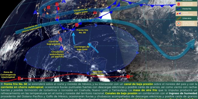 El ingreso de aire maritimo tropical proveniente del mar Caribe y un amplio anticiclón en niveles medios de la atmósfera, continuarán generando cielo despejado y nubosidad dispersa sin probabilidad de lluvia en Yucatán, Campeche y Quintana Roo. Asimismo,