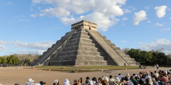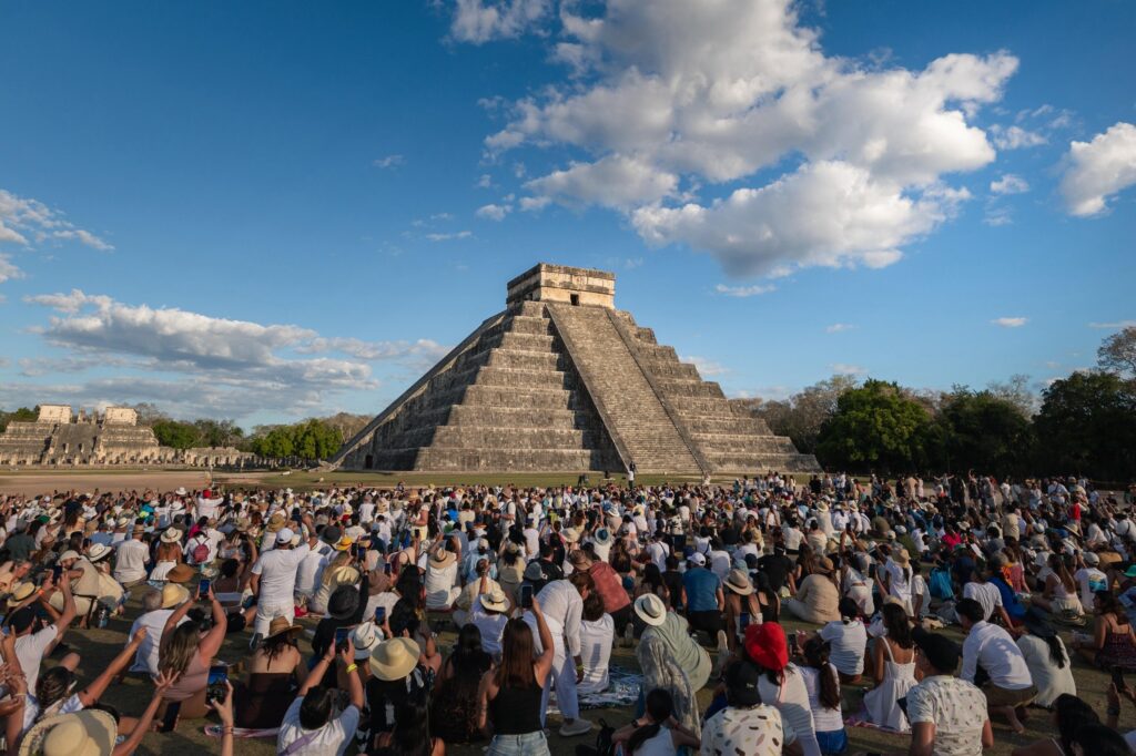 Tinum, Yucatán, a 23 de marzo de 2026.- En lo que va del Operativo de Equinoccio de Primavera en la ciudad prehispánica de Chichén Itzá, más de 15 mil personas han presenciado el descenso de Kukulcán en El Castillo. La deidad ancestral, cuya llegada anuncia buenos augurios para el Mayab, respondió al encuentro con la historia al aparecer con sus siete triángulos perfectamente formados antes del ocaso.