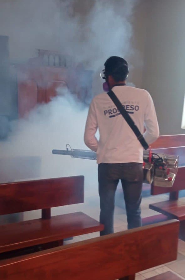 Progreso, Yucatán a 15 de enero de 2022. Escuelas, iglesias, transporte público, vehículos oficiales, clínicas, comisarías así como todas las oficinas del Ayuntamiento de Progreso continúan siendo sanitizadas por parte de la Subdirección de Ecología, a fin de contrarrestar los efectos de la pandemia por COVID-19 en el municipio.