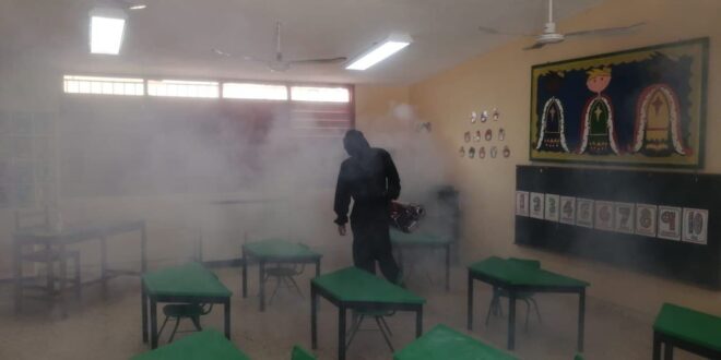Entre los espacios que se sanitizaron están el Centro de Atención Múltiple No. 5, las escuelas “María Isabel Pérez de Rivero”, “Feliciano Canul Reyes”, “Juan Miguel Castro” y “21 de marzo” de la comisaría de Flamboyanes; “José Clemente Orozco” del puerto de Chelem, la “Andrés Quintana Roo” de Chicxulub puerto y el Jardín de niños de la naval.