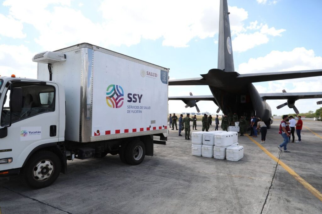 Por instrucción del Gobernador Mauricio Vila Dosal, el director de Prevención y Protección de la Salud de la SSY, Carlos Isaac Hernández Fuentes, acudió a la Base Aérea Militar (BAM) Número 8 para supervisar la llegada de este nuevo cargamento, que arribó a bordo de una aeronave Hércules de la Fuerza Aérea Mexicana matrícula 3611 proveniente de la Ciudad de México, que tocó territorio estatal a las 1:41 de la tarde.