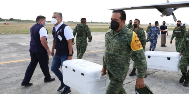 En el arribo del nuevo lote, también estuvieron el responsable de Vacunación de la SSY, Alejandro Díaz Sánchez, el comandante del 11 Batallón de Infantería, coronel Gustavo Caratachea Esparza y el general de Grupo Piloto Aviador José de Jesús Morán Gutiérrez, comandante de la BAM número 8.