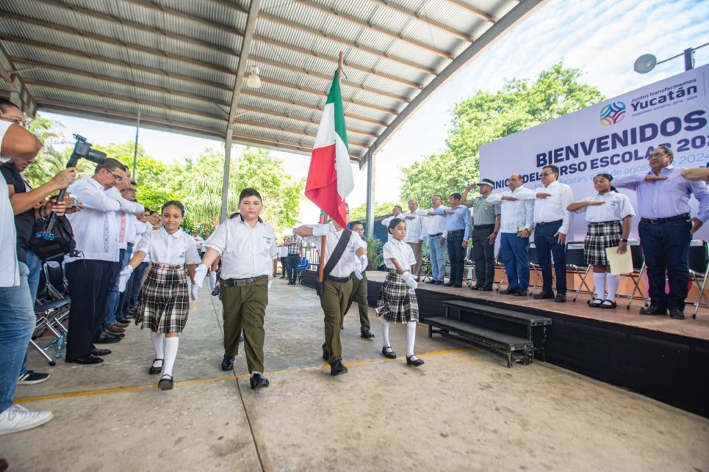 Mérida, Yucatán, a 26 de agosto de 2024. Más de 500 mil estudiantes de Educación Básica y Media Superior, iniciaron este día el curso escolar 2024 – 2025, retornando a sus escuelas con el entusiasmo del reencuentro y de nuevos aprendizajes. En este marco, en la Escuela Primaria “Solidaridad” ubicada en el fraccionamiento Fidel Velázquez, del oriente de Mérida, se realizó la ceremonia oficial que fue encabezada por autoridades estatales, federales, directores, docentes y padres de familia.