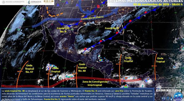 MÉRIDA, Yucatán a 02 de octubre de 2019.- Este sábado el sistema frontal 8, extendido desde la Sonda de Campeche al sur de la Florida, se verá reforzado por una nueva masa de aire frío y se desplazará lentamente al norte y occidente de la Península de Yucatán, informa el OCPY de la Conagua.