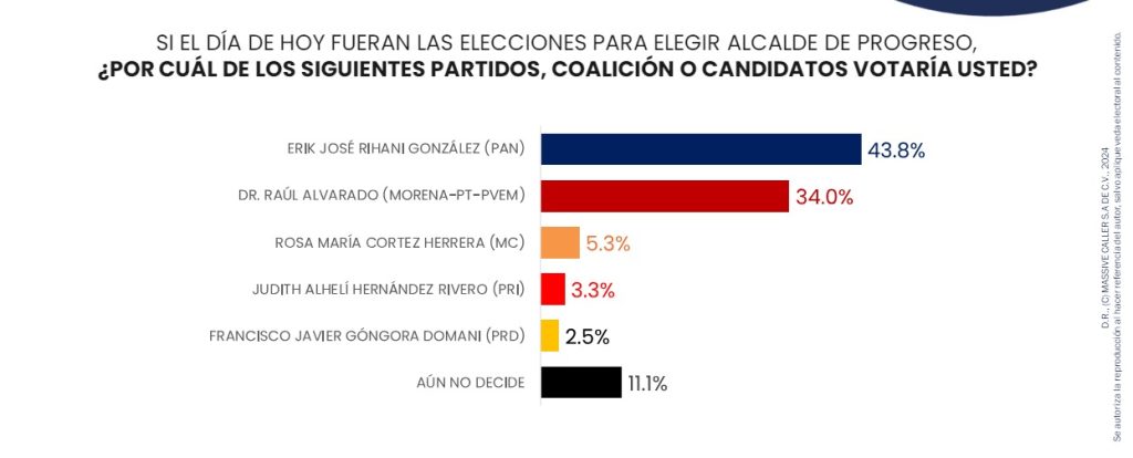 La encuesta más reciente publicada este 10 de mayo por Massive Caller, ratifica a Erik Rihani como amplio favorito para ganar la alcaldía de Progreso, y es que de acuerdo a esta casa encuestadora, el panista cuenta con 43.8% de la aprobación ciudadana, seguido por el candidato de Morena, Raúl Álvarado con el 34.00%; Rosa María Cortéz de Movimiento Ciudadano con 5.3%.