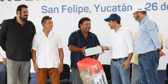 San Felipe, Yucatán, 26 de julio de 2022.- Durante la entrega de apoyos del programa Peso a Peso Pesquero y Acuícola a hombres y mujeres del oriente del estado, el Gobernador Mauricio Vial Dosal anunció un conjunto de acciones para impulsar esta actividad y el turismo, así como mejorar la imagen de San Felipe, proyectos que redundarán en mejores oportunidades y más empleos para las familias.