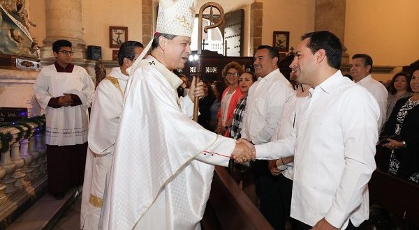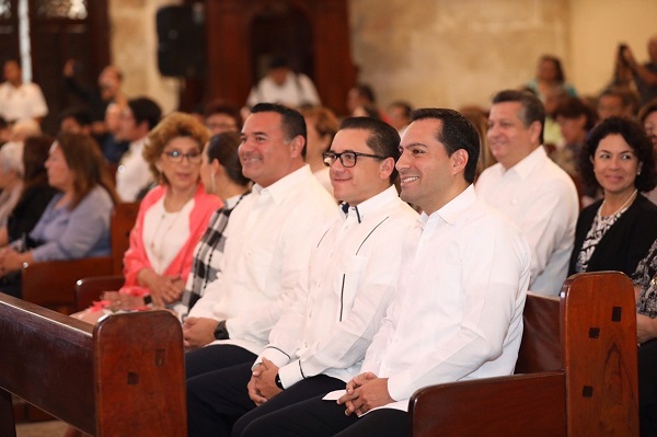 Acompañado del alcalde de esta ciudad, Renán Barrera Concha; de la secretaria general de Gobierno, María Fritz Sierra; el subsecretario de Desarrollo Social y Asuntos Religioso, Víctor Hugo Lozano Poveda; Vila Dosal escuchó la misa que ofició el arzobispo de Yucatán, Gustavo Rodríguez Vega.