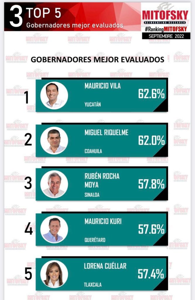 De acuerdo con Mitofsky, el promedio sobresaliente es del 60 por ciento en adelante, pero Vila Dosal lo superó colocándose por encima de los mandatarios estatales Miguel Riquelme, de Coahuila, con 62.0; Rubén Rocha, de Sinaloa, con 57.8; Mauricio Kuri, de Querétaro, con 57.6 y Lorena Cuéllar, de Tlaxcala, con 57.4.