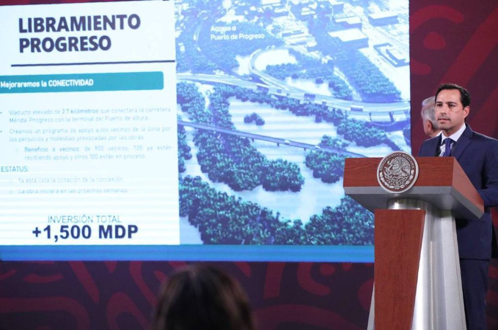 Agregó que, para complementar los trabajos antes mencionados, se erigirá el viaducto elevado de 2.7 kilómetros, que conectará la carretera Mérida-Progreso con la terminal del Puerto de Altura, labor que se espera iniciar en las próximas semanas, con una inversión de 1,500 millones de pesos. Recordó que se creó un programa de apoyo a vecinos de la zona, por los perjuicios y molestias que estas acciones provocarán, y de los 900 habitantes del área, 720 ya lo reciben y 100 están en proceso.