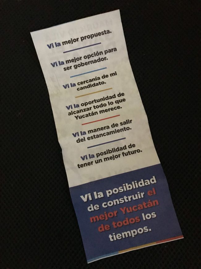 Minutos antes de que inicie el debate de gobernadores el candidato del PAN MC Mauricio Vila Dosal ya tiene una estrategia que confunde a los ciudadanos porque afirma que es ganador antes de ir al debate, como lo demuestra un volante que ya tiene preparado para tal fin.
