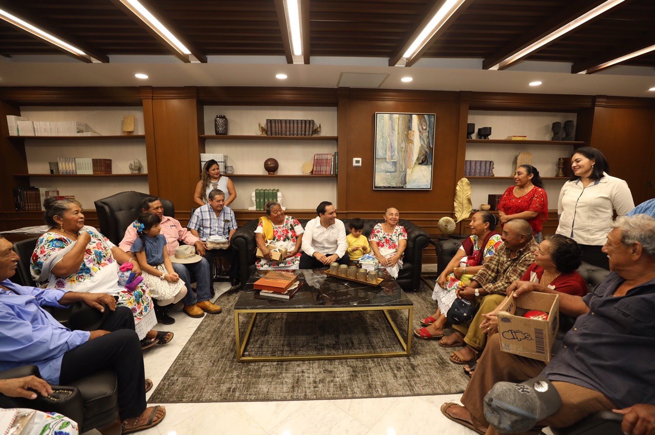 Vila Dosal recibió en su Despacho de Palacio de Gobierno la visita de padres, madres, hermanas y sobrinos de migrantes yucatecos que, debido a su situación legal, no han podido regresar para visitar a sus parientes, quienes le llevaron artículos y productos que envían con mucho cariño para que puedan tener un pedacito de Yucatán en sus hogares en territorio estadounidense.