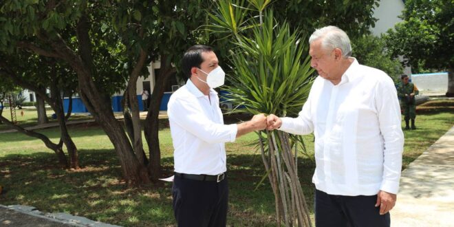 Mérida, Yucatán, 10 de julio de 2021.- El Gobernador Mauricio Vila Dosal se reunió este día con el presidente Andrés Manuel López Obrador, quien realiza en Yucatán una supervisión aérea de los tramos 3 Calkiní-Izamal y 4 Izamal-Cancún del proyecto del Tren Maya que se desarrollan en territorio estatal.