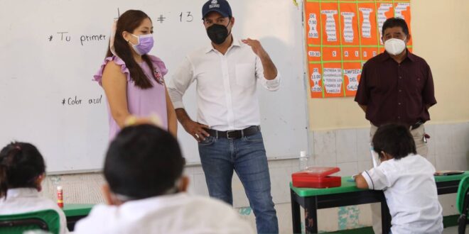 Para ello, Vila Dosal visitó, junto con el alcalde anfitrión, Alberto Pacab Herrera y el director de esta escuela, Wilbert Enrique Caamal Chi, salones y grupos de todos los grados, donde aprovechó para conversar con los alumnos, así como con el personal docente sobre el regreso a clases presenciales, quienes le aseguraron sentirse contentos por participar en esta modalidad, lo cual les permite una interacción cercana de unos con otros de forma segura.