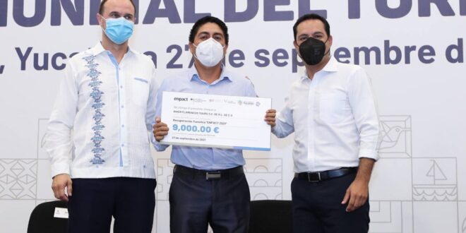 En el marco del Día Mundial del Turismo, que tiene como lema “Turismo para un crecimiento inclusivo”, el Gobernador Mauricio Vila Dosal, acompañado de Matthias Treutwein, cofundador y director de Enpact, que es una organización no gubernamental alemana, entregaron estímulos económicos a los 20 negocios turísticos correspondientes a la convocatoria del 2021, al tiempo que reconocieron a los 15 que fueron seleccionados el año pasado. Cada una de las empresas yucatecas beneficiadas recibe 9,000 euros, lo que equivale a 211,590 pesos al tipo de cambio actual.