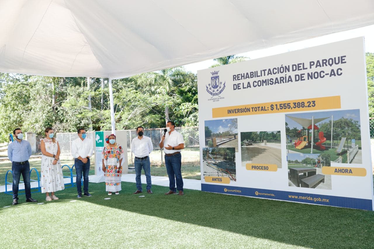 “Aquí estuvimos desde el primer momento, el Gobierno del Estado y el Ayuntamiento de Mérida trabajando de manera coordinada y para nosotros era muy importante también reactivar el ánimo de la comisaría de Noc-Ac, por eso, en conjunto con el Ayuntamiento, emprendimos diversos apoyos para respaldar a los habitantes y quiero felicitar al alcalde porque lo que hoy se ve en Noc-Ac con el renovado parque y la rehabilitación de calles, es una atención completa a la población”, afirmó el Gobernador durante su tercera visita a esta comisaría meridana, la cual resultó la más afectada por las intensas lluvias en 2020.