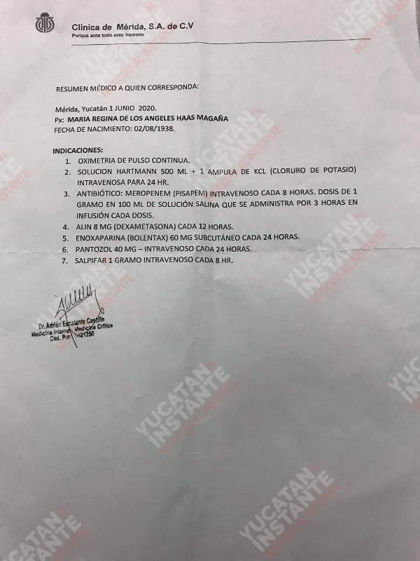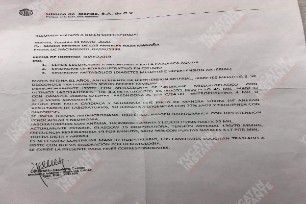 “A los médicos y enfermeras de turno, se le mostró las pruebas de Covid-19 que se le aplicó en la Clínica Mérida, las cuáles resultaron ser negativa, pero alegaron que esa prueba no era confiable”, expuso la sobrina.
