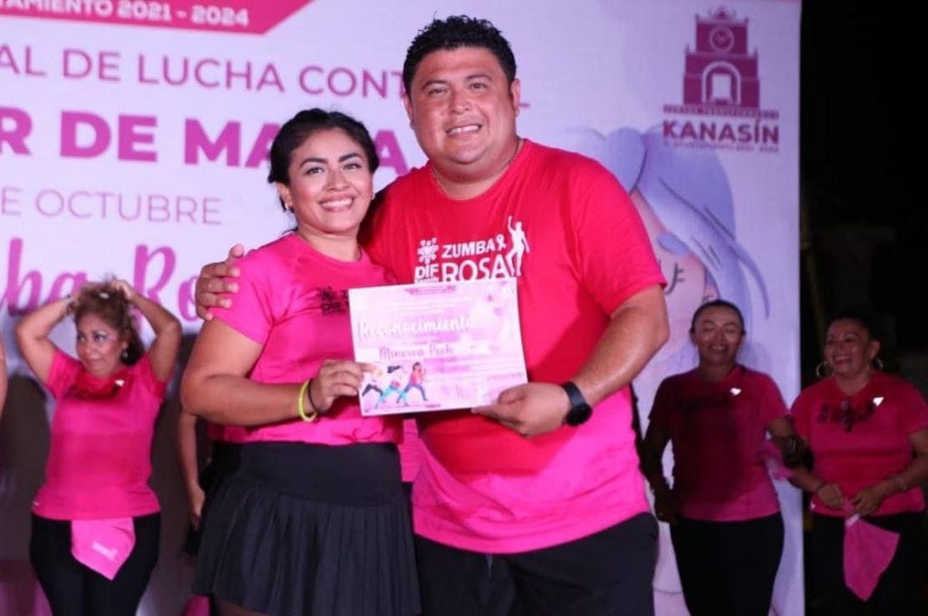El alcalde Edwin Bojórquez Ramírez y esposa, Raquel Balam Rocha de Bojórquez, presidenta del DIF de Kanasín, subieron al escenario y dirigieron un mensaje a las mujeres que desde temprana hora llegaron para participar en este evento, quienes en su mayoría portaron playeras de color rosa.