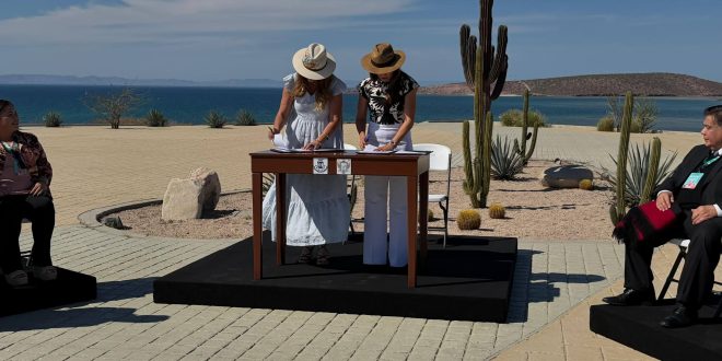 Posteriormente, Cecilia Patrón firmó un convenio de colaboración con el municipio de La Paz, Baja California Sur, que encabeza Milena Paola Quiroga Romero, para compartir experiencias en materia económica, turística, cultura y empleo.