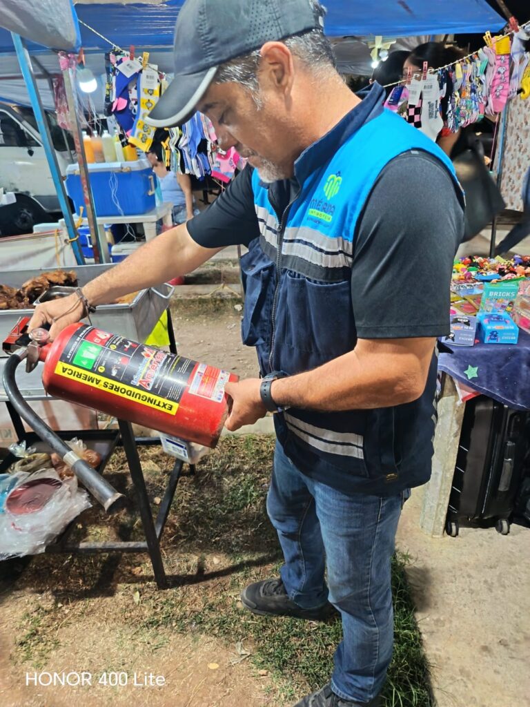 La seguridad es otro de los ejes principales de las acciones municipales. Todos los días se revisa que los tanques de gas utilizados en puestos de comida se encuentren en óptimas condiciones y que no excedan los 10 kilogramos permitidos. Asimismo, se supervisa que los establecimientos cuenten con extintores funcionales y con sellos de verificación emitidos por la autoridad competente.