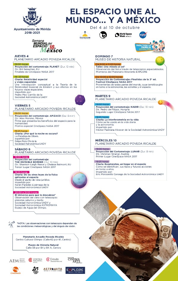 Cada día de la semana se proyectarán cortometrajes ganadores y finalistas del concurso internacional de producción de cortos cinematográficos Cine Space, organizado por la NASA y la Houston Cinema and Arts Society, seguido de conferencias con integrantes de la Sociedad Astronómica de la UADY, Astromaya (Sociedad de Astronomía de Mérida) y el Planetario Itinerante Explore. Las proyecciones comenzarán a las 19:00 horas -excepto la del domingo 7 que será de 10:00 a 12:00 horas- mientras que las charlas serán a las 19:25 horas, todas en el Planetario “Arcadio Poveda Ricalde”.
