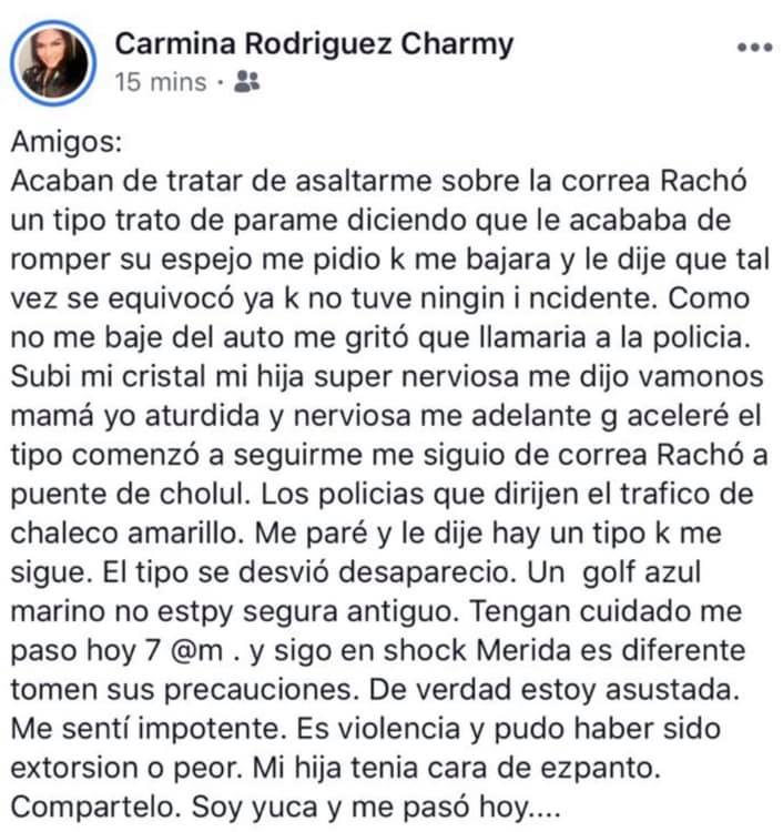 De acuerdo con información de Carmina Rodríguez C. relató que el día de hoy poco antes de las 7 am, al transitar por la avenida Correa Rachó, al norte de Mérida un sujeto trató de intimidarla para que detuviera su vehículo alegando que cuadras atrás le había roto su retrovisor e inclusive le cerró el paso para que se detuviera.