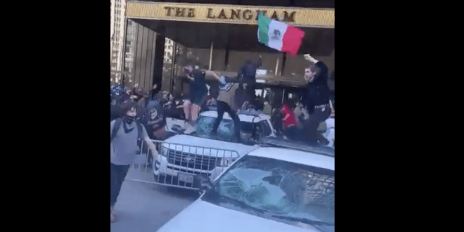 En los disturbios de este sábado afuera de la Torre Trump, en Chicago, los manifestantes destruyeron y saltaron sobre los vehículos. Uno de ellos también portaba la bandera mexicana.