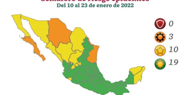 La Secretaría de Salud dio a conocer, la tarde del viernes 7 de enero de 2022, el semáforo covid que estará vigente del 10 al 23 de enero de 2022.