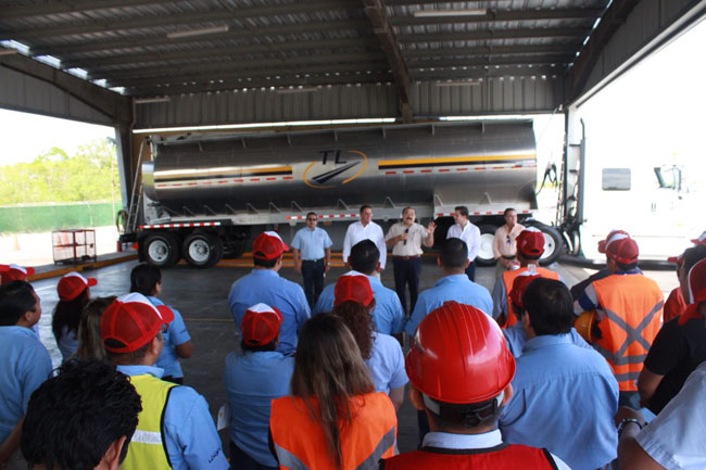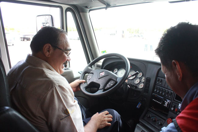 Acto seguido, Ramírez Marín subió a un tractocamión con capacidad de 30 toneladas y acompañado de Juan Manuel Díaz Roche, vicepresidente del Consejo de Administración de Grupo Logra y un operador, le dio una vuelta al pesado vehículo, ante las sonrisas y las muestras de aprobación de los trabajadores.