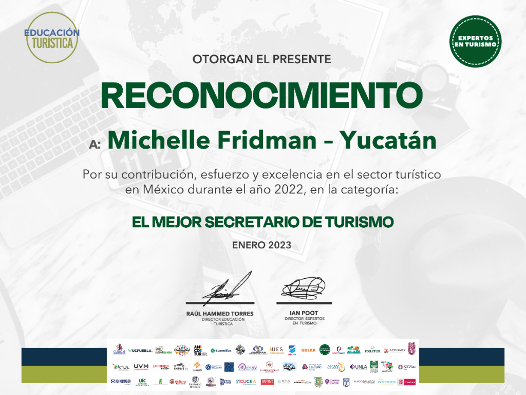 Dicha Institución, año con año convoca y reúne a líderes de la industria turística de México, así como a todos aquellos especialistas responsables de formar a los próximos líderes del turismo nacional, y seleccionan de entre diversos actores de la industria pública, privada y de gobierno a quienes con sus acciones contribuyen a mejorar diversos aspectos del sector en el país, siendo en la última edición de esta votación, donde se reconoció a Michelle Fridman Hirsch, Titular de la Secretaría de Fomento Turístico de Yucatán (Sefotur), como “Mejor Secretaria de Turismo”