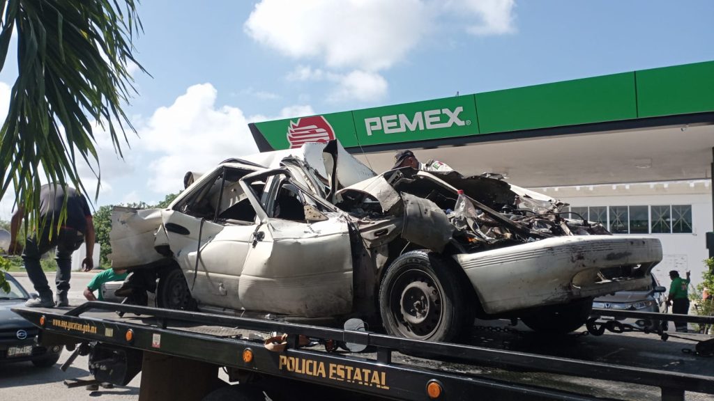 MÉRIDA, Yuc., 30 de julio 2025.- Esas fueron las impresiones de asombro de los testigos que presenciaron una brutal carambola a la altura del puente de los Héroes, al quedar prensado un vehículo Tsuru entre dos camiones.