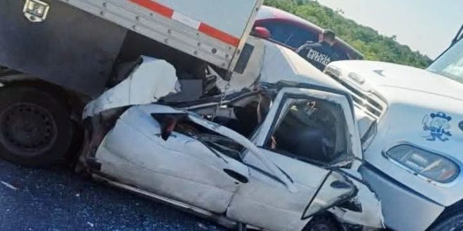 Detrás, el camión del Oxxo fue impactado por el Nissan Tsuru que no alcanzó a frenar. A su vez, un camión de materiales de construcción que venía a alta velocidad embistió al Tsuru, dejándolo prensado entre ambas unidades pesadas.