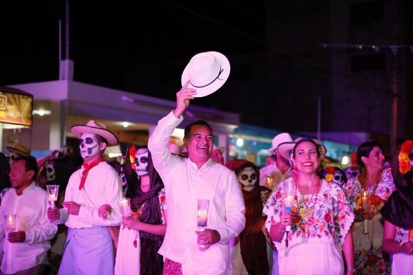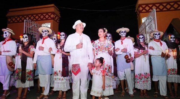 Acompañado de su esposa Diana Castillo Laviada, presidenta del DIF Municipal, y de sus hijos Renán y Daniela, todos luciendo el traje regional, el presidente municipal llegó al Cementerio poco antes de las 20 horas para encabezar el tradicional evento.