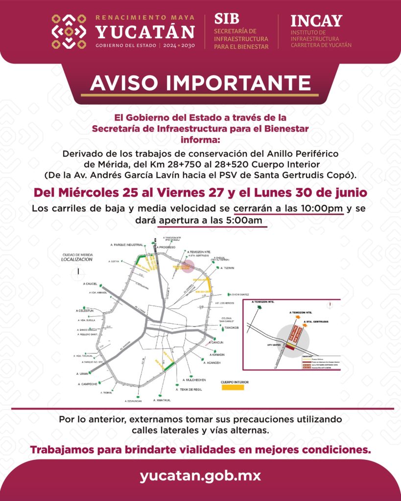 · Concluyeron trabajos de conservación entre la Facultad de Ingeniería y el puente de la salida a Progreso; del 25 al 30 de junio continuarán labores nocturnas en el tramo Andrés García Lavín–Santa Gertrudis Copó.