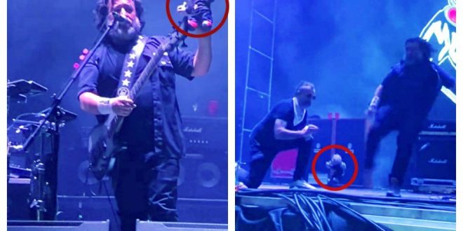 El músico cayó al suelo, segundos después se puso de pie y a modo de “venganza” le propinó al Dr. Simi una serie de golpes contra algunas de las herramientas de la banda, para después lanzarlo a otra zona del escenario.