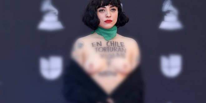 La artista chilena Mon Laferte ha aprovechado la alfombra roja de los Grammy Latinos, que se celebran este jueves en Las Vegas, para protestar por la violencia que vive su país. Durante las fotos, ante cientos de medios internacionales, se ha abierto el vestido y sobre su pecho ha mostrado un mensaje rotundo: “En Chile torturan, matan y violan”. Y sobre su cuello, un pañuelo verde a favor de la legalización del aborto.