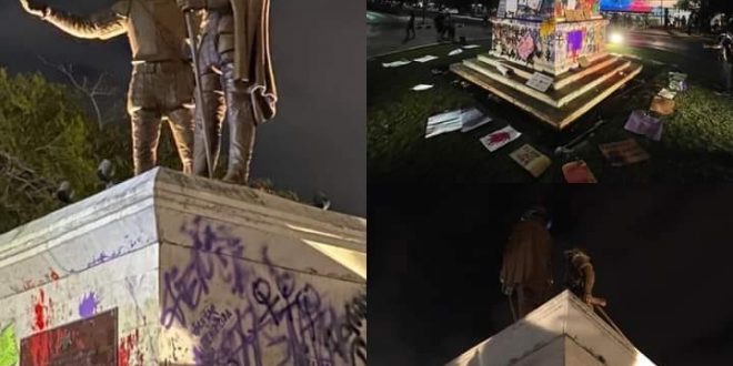 Con consignas como “México feminicida”, “Muera el patriarcado”, “Asesinos de mayas”, dicho monumento, que se encuentra en el punto donde inicia Paseo de Montejo, en una glorieta a la altura de la calle 47 del Centro, terminó irreconocible.