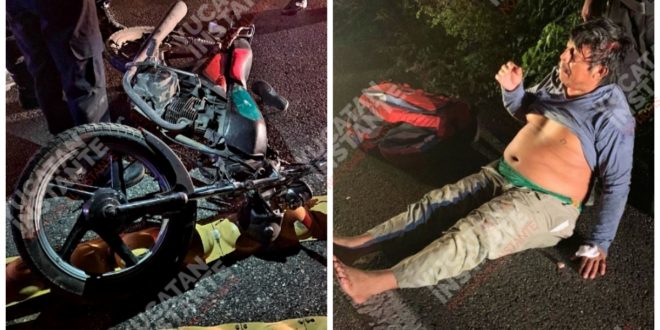 Tetiz, Yuc., 12 de noviembre.- Paulino Canto Chim, de 52 años tuvo un buen ‘porrazo’ en el pavimento cuando iba a bordo de su caballo de acero, pues uno de los neumáticos “pellizcó” las boyas y derrapar a la altura del entronque Tetiz – Hunucmá, justo donde termina el tramo federal Mérida – Tetiz.