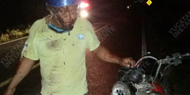 Tetiz, Yuc., 23 de mayo 2020.- San Cristóbal K.P., de 20 años, quien guiaba su motocicleta anteayer en la noche en la vía Tetiz – Hunucmá, perdió el control debido a su estado alcoholizado, aparte también se quedó sin dientes y bulto donde llevaba sus identificaciones.
