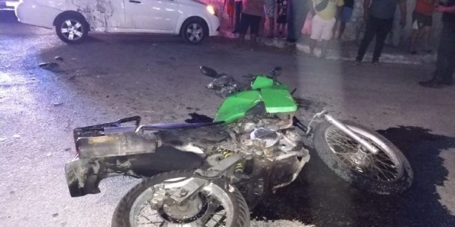 A las 18:20 horas de ayer, el Aveo blanco placas YYL-188-C, conducido por Mario Canul Canché, transitaba de Sur a Norte sobre la calle 32, y al llegar a la esquina de la 33 no hizo su alto total y fue chocado por la Kawasaki 650 c.c., verde, tipo cros, conducida por Jorge Alejandro Pech Dzul, de 20 años de edad. La moto se impactó en una portezuela.
