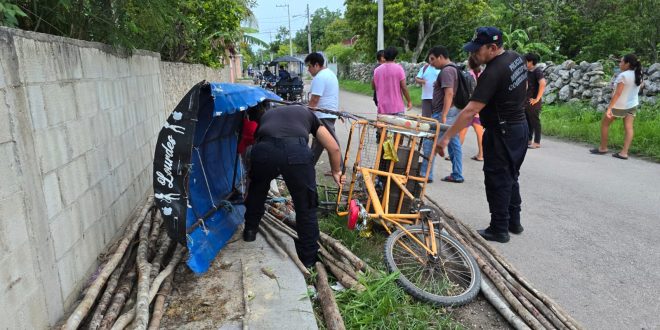 Según los hechos Óscar Tzuc (a) “Macareno” de 34 años de edad, iba a bordo de su motocicleta, circulando de sur a norte, cuando en dicha arteria asomaba del otro carril el señor Julio Dzul de 70 años, en su vehículo ligero cargado de varios palos que tenía amarrado en vertical y otros en forma horizontal en la base del toldo.