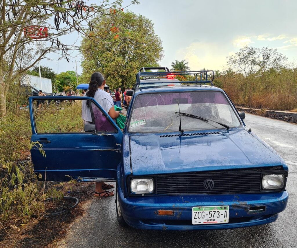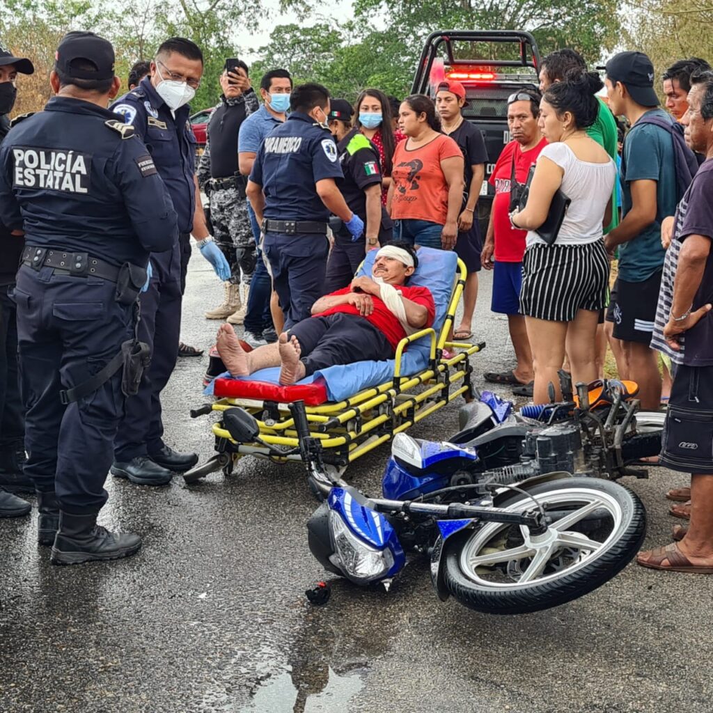 Por lo cual don Richard Oscar Uc Canul, 46 años, quien guiaba su motocicleta 150 cc., y pretendía ingresar a mencionada comunidad donde vive, terminó colisionando con el vetusto Volkswaguen. Ante el seco y mojado porrazo, testigos pidieron de inmediato ayuda. Al sitio arribaron primero elementos de la Policía Municipal y posterior oficiales de la Secretaría de Seguridad Pública, lo mismo que paramédicos de la unidad 21-L, de la SSP.