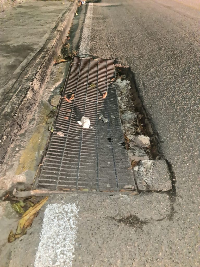La enorme hendidura a lado de un pozo pluvial situado sobre dicha arteria, causó que Russell (a) “Papo” no se diera cuenta y se trabe una de las llantas, para perder así el control de la unidad ligera hasta acabar volcando de costado.