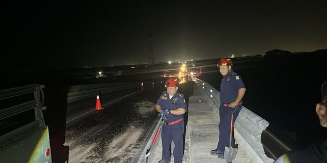 UMÁN, Yuc., 22 de enero 20226.- ​Una amplia movilización de unidades de emergencia se registró la madrugada de este jueves tras el reporte de un derrame de hidrocarburo sobre la carretera Umán–Ixtepén, específicamente en la zona del puente del Tren Maya.